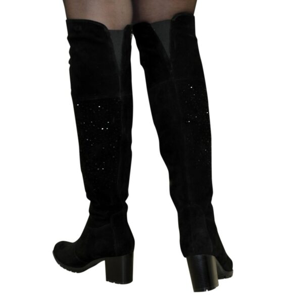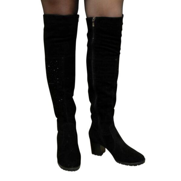 Стильні жіночі ботфорти із натуральної замші чорного кольору, з гумкою у верхній частині чобота, на потовщеній підошві. Декоровані камінням.