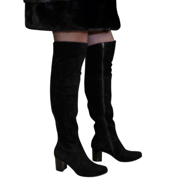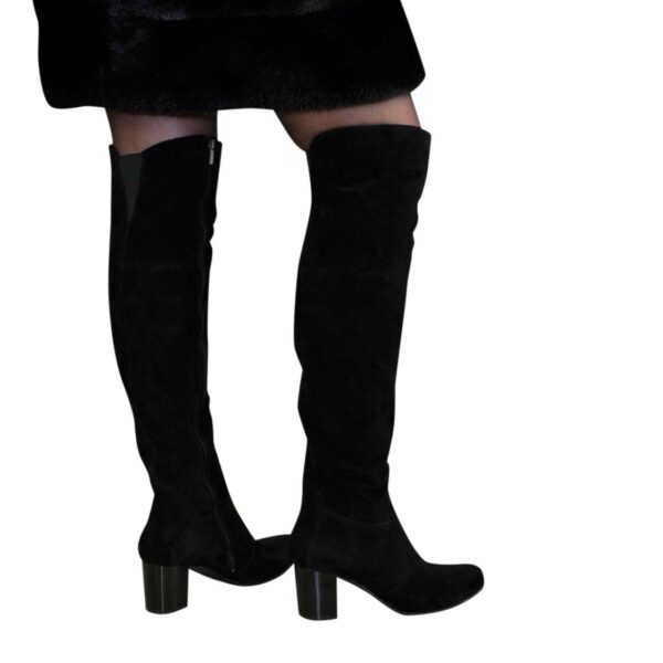 Стильні жіночі ботфорти із натуральної замші чорного кольору, з гумкою у верхній частині чобота, на потовщеній підошві.