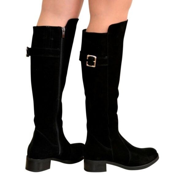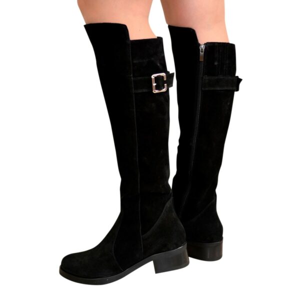 Стильні жіночі чоботи з натуральної замші чорного кольору з регулювальним ремінцем у верхній частині чобота, на потовщеній підошві.