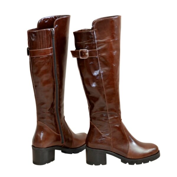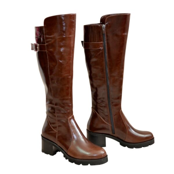 Стильні жіночі чоботи з натуральної шкіри коньячного кольору з регулювальним ремінцем у верхній частині чобота, на потовщеній підошві.