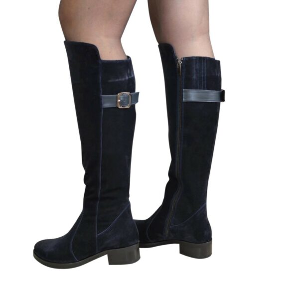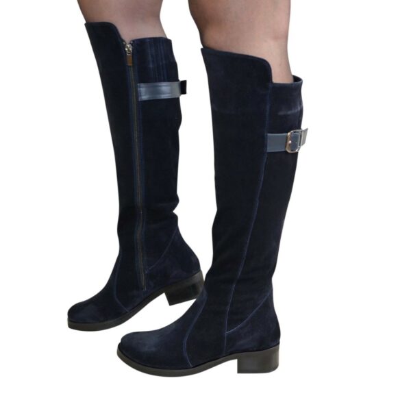 Стильні жіночі чоботи ботфорти з натуральної замші синього кольору з регулювальним ремінцем у верхній частині чобота на потовщеній підошві.