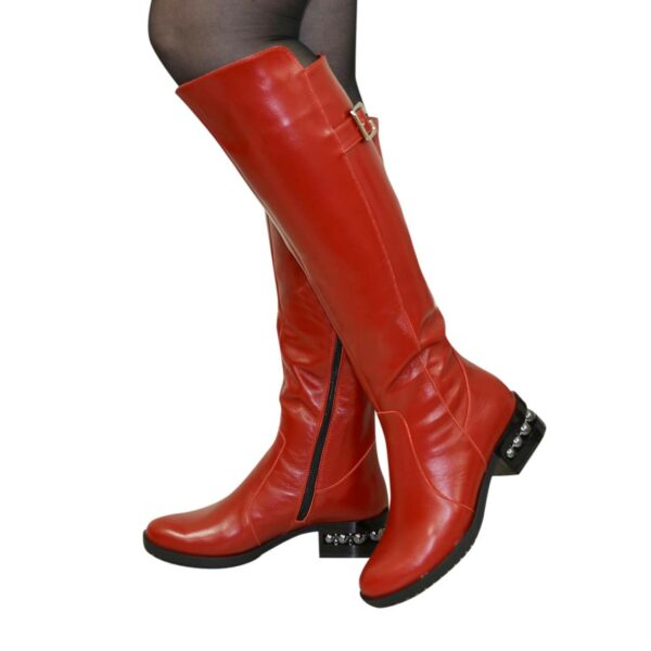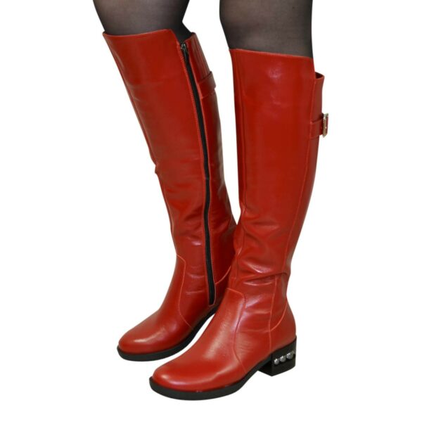 Стильні жіночі чоботи з натуральної шкіри червоного кольору з регулювальним ремінцем у верхній частині чобота, на потовщеній підошві.