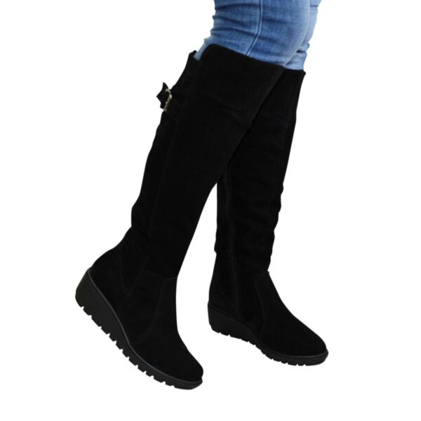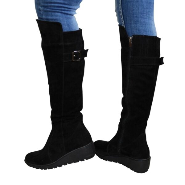 Стильні жіночі чоботи з натуральної замші чорного кольору з регулювальним ремінцем у верхній частині чобота, на потовщеній підошві.