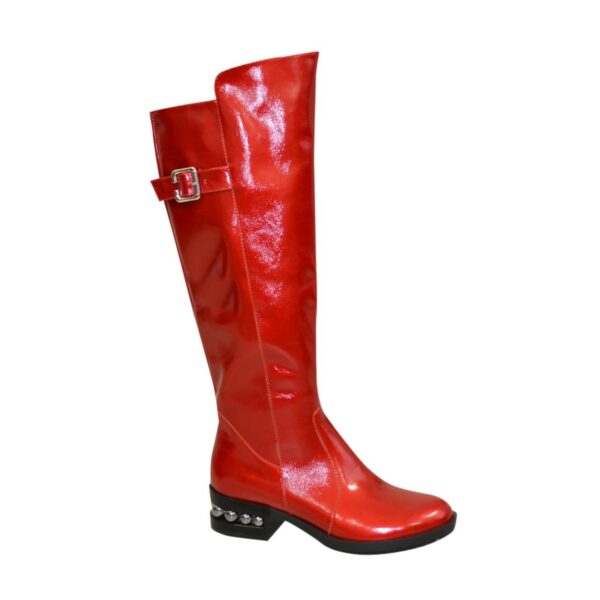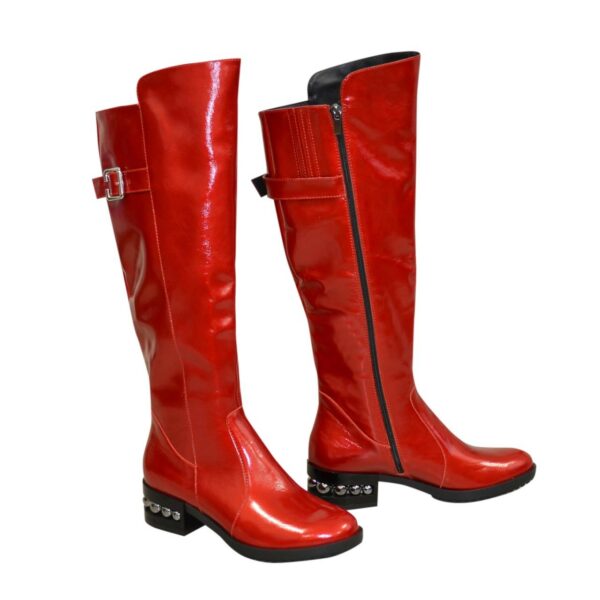 Стильні жіночі чоботи з натуральної лакової шкіри червоного кольору з регулювальним ремінцем у верхній частині чобота, на потовщеній підошві. Обсяг гомілки можна замовити від 35 см до 40 см для будь-якого розміру.