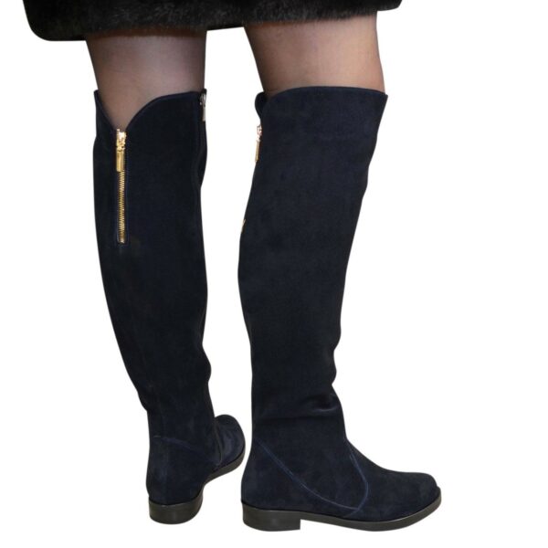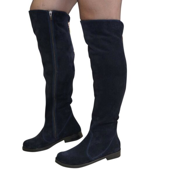 Стильні жіночі ботфорти з натуральної замші синього кольору з регулювальним клапаном у верхній частині чобота на потовщеній підошві.