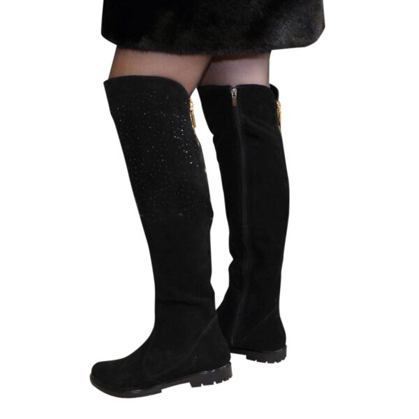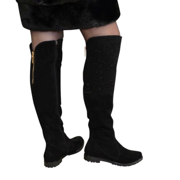 Стильні жіночі ботфорти з натуральної замші чорного кольору з регулювальним клапаном у верхній частині чобота на потовщеній підошві.
