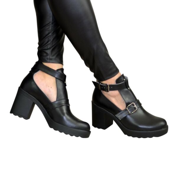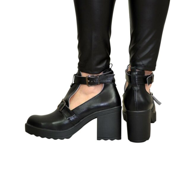 Стильні жіночі напіввідкриті ботильйони з чорної натуральної шкіри, на широкому стійкому підборі 7.5 см. спереду 1.5 см. Завдяки ремінцю регулюється обхват щиколотки. Ручної роботи з використанням виключно натуральних матеріалів високої якості. Відповідають стандартній розмірній сітці. Розраховані на стандартну повноту стегна. Можливий відшив у шкірі, замші різних кольорів.