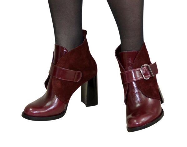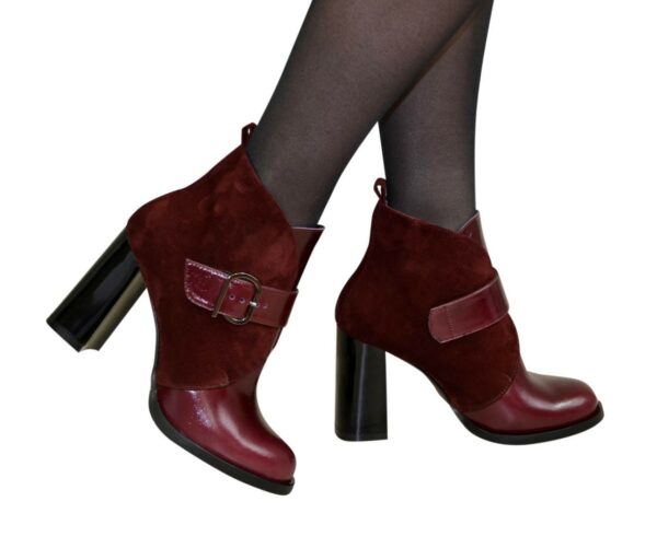 Класичні жіночі черевики на високому стійкому підборі, виготовлені з натуральної шкіри та замші бордового кольору. Підйом регулюється ремінцем. Дуже зручні, ідеально сидять на ніжці.