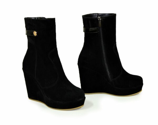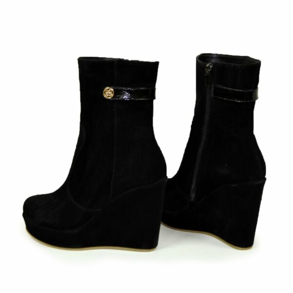 Стильні жіночі черевики на обтягнутій чорній натуральній замші, виготовлені з натуральної замші чорного кольору. Декоровані ремінцем, з натуральної лакової чорної шкіри та фурнітурою. Комфортні та ошатні, ідеально сидять на ніжці.
