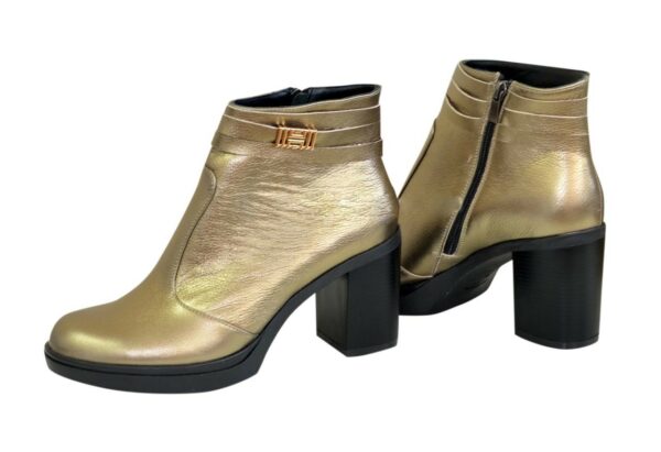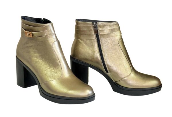 Елегантні класичні жіночі черевики на широкому стійкому підборі, виготовлені з натуральної шкіри та ремінцями бронзового кольору, прикрасою у вигляді пряжки золотого кольору. Дуже зручні, ідеально сидять на ніжці.