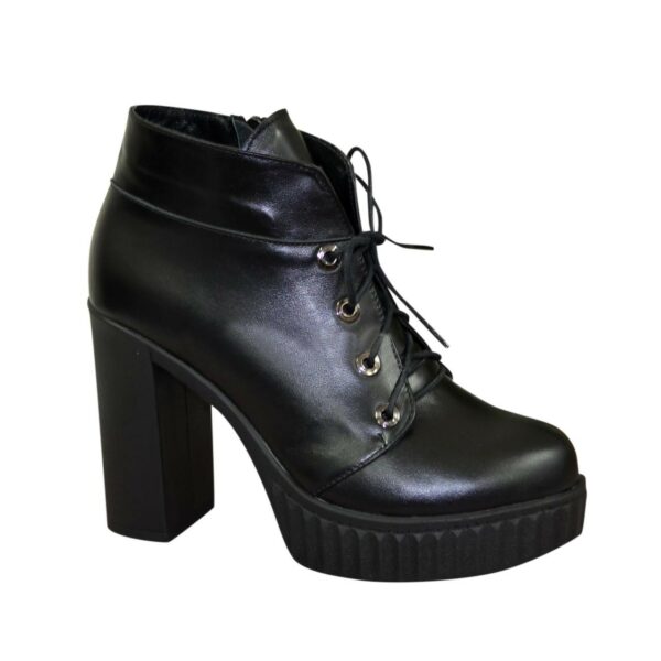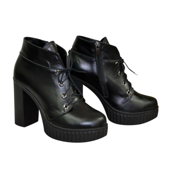 Модні жіночі черевики на широкому стійкому підборі, виготовлені з натуральної шкіри чорного кольору. На шнурівці завдяки якій регулюється підйом. Дуже зручні, ідеально сидять на ніжці – підкреслять Вашу індивідуальність