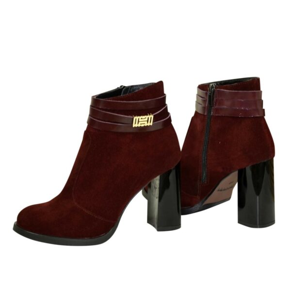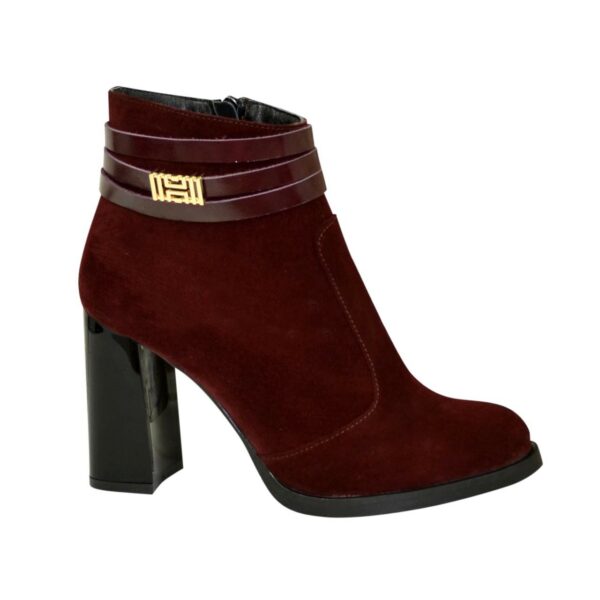 Класичні елегантні жіночі черевики на широкому стійкому підборі, виготовлені з натуральної замші та лаковими шкіряними ремінцями бордового кольору з прикрасою у вигляді пряжки золотого кольору. Дуже зручні, ідеально сидять на ніжці.