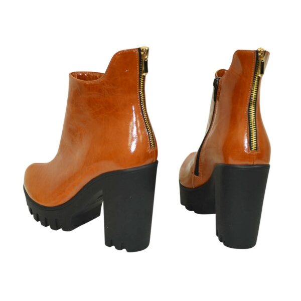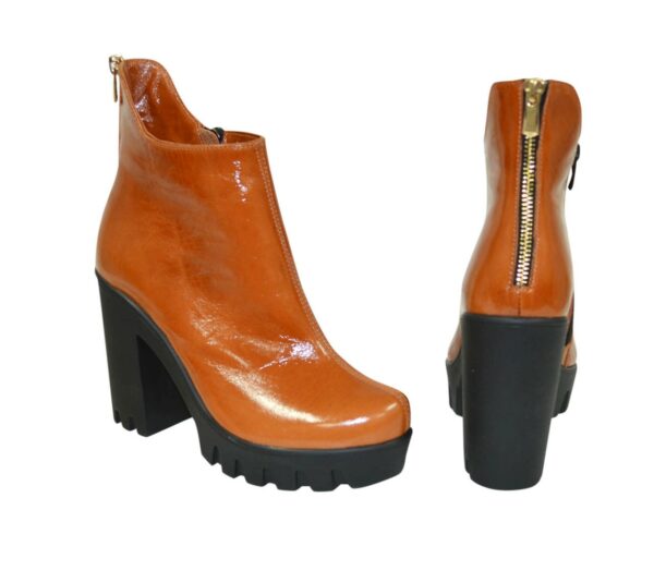 Стильні жіночі черевики на потовщеній підошві з високим підбором, виготовлені з натуральної шкіри рудого кольору. У частині п'яти декоровані блискавкою. Комфортні та ошатні, ідеально сидять на ніжці.