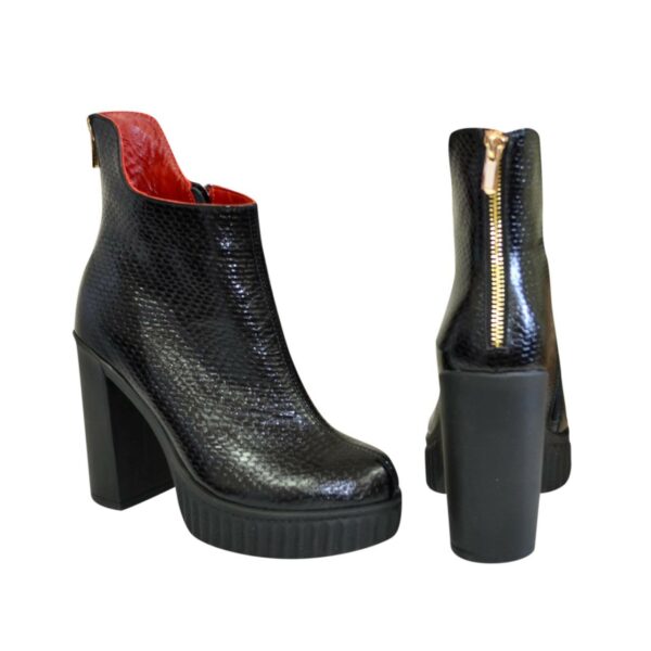 Стильні жіночі черевики на потовщеній підошві з високим підбором, виготовлені з натуральної шкіри пітон чорного кольору. У частині п'яти декоровані блискавкою. Комфортні та ошатні, ідеально сидять на ніжці.