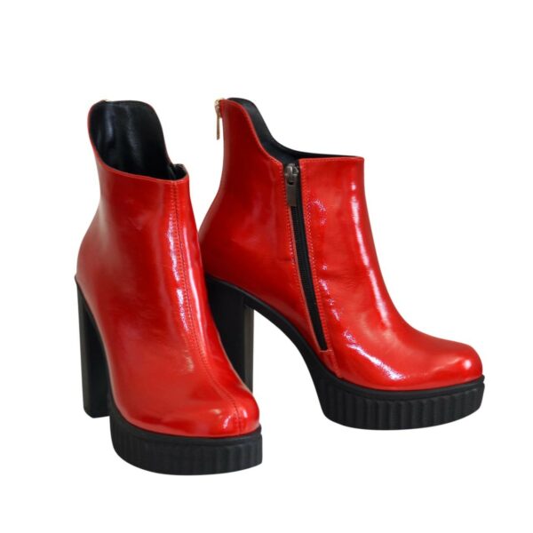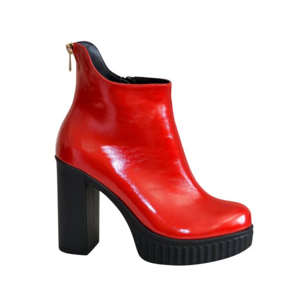 Стильні жіночі черевики на потовщеній підошві з високим підбором, виготовлені з натуральної лакової шкіри червоного кольору. У частині п'яти декоровані блискавкою. Комфортні та ошатні, ідеально сидять на ніжці.