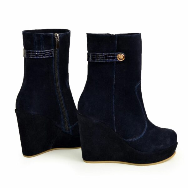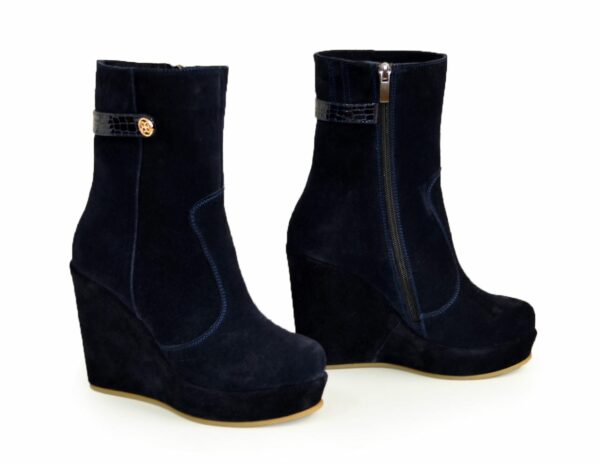 Стильні жіночі черевики на обтягнутій синій замшею, виготовлені з натуральної замші синього кольору. Декоровані ремінцем, з натуральної лакової синьої шкіри з тисненням "рептилії", та фурнітурою. Комфортні та ошатні, ідеально сидять на ніжці.