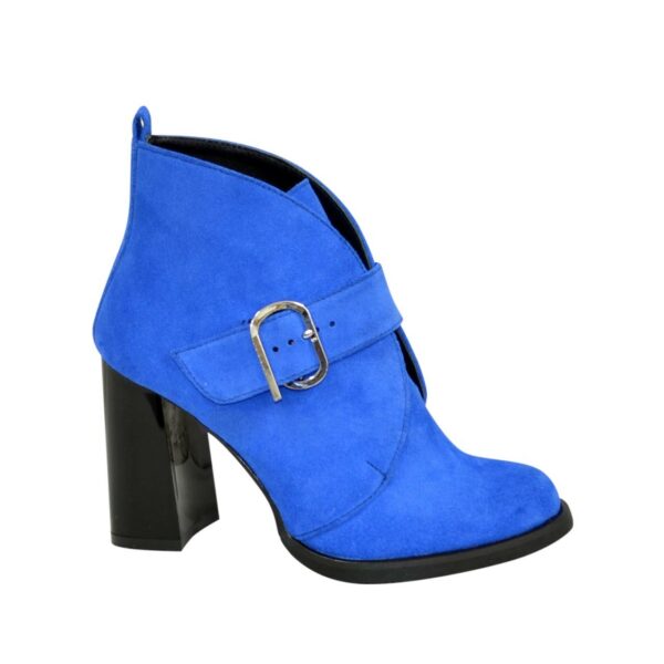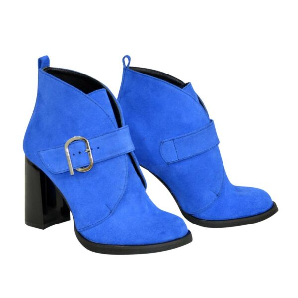 Класичні жіночі черевики на стійких підборах, виготовлені з натуральної замші кольору електрик. Підйом регулюється ремінцем. Дуже зручні, ідеально сидять на ніжці.