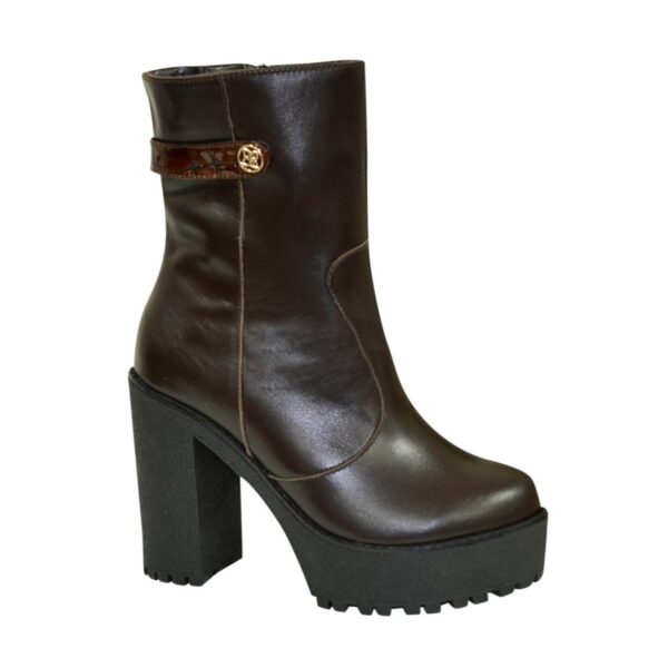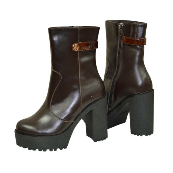 Черевики жіночі на широкому стійкому підборі, виготовлені з натуральної шкіри коричневого кольору. Декоровані ремінцем, з натуральної лакової коричневої шкіри з тисненням "рептилії", та фурнітурою. Незамінні на кожен день, дуже зручні, практичні, ідеально сидять на ніжці – підкреслять Вашу індивідуальність.