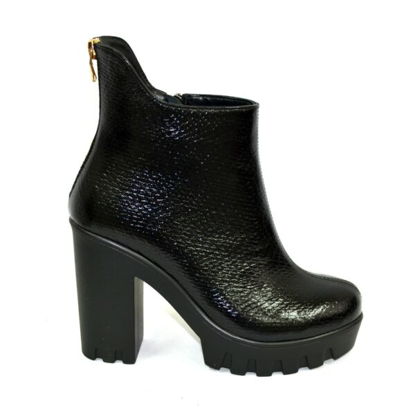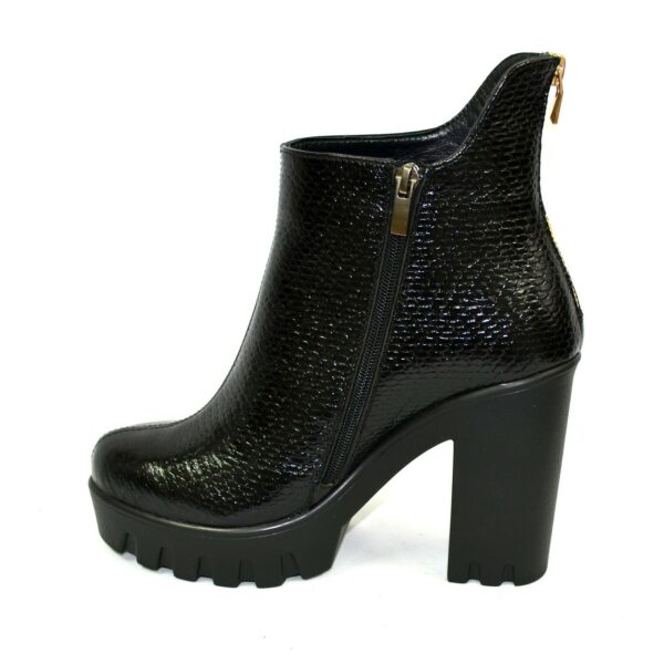 Стильні жіночі черевики на потовщеній тракторній підошві з високим підбором, виготовлені з натуральної шкіри пітон чорного кольору. У частині п'яти декоровані блискавкою. Комфортні та ошатні, ідеально сидять на ніжці.