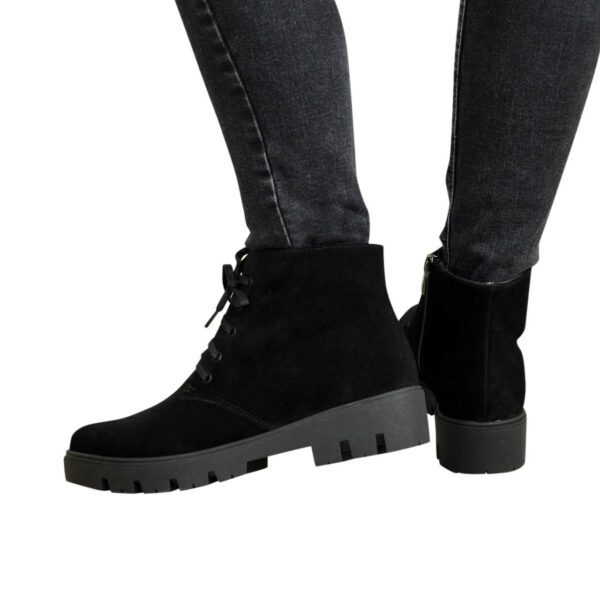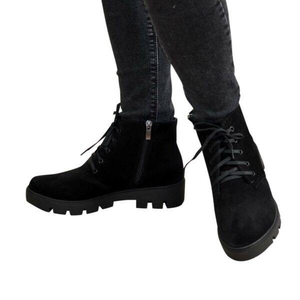Класичні жіночі черевики на потовщеній тракторній підошві виготовлені з натуральної замші чорного кольору. З блискавкою та шнурівкою завдяки якій регулюється підйом. Дуже зручні, ідеально сидять на ніжці.