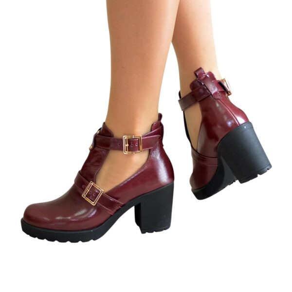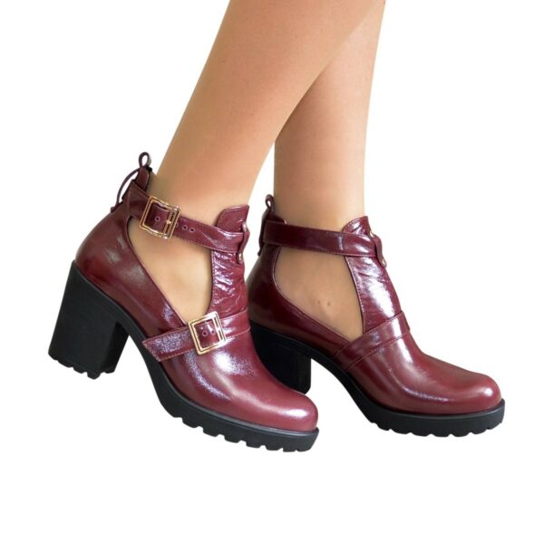 Стильні жіночі напіввідкриті ботильйони з натуральної бордової шкіри, на широкому стійкому підборі 7.5 см. спереду 1.5 см. Завдяки ремінцю регулюється обхват щиколотки. Ручної роботи з використанням виключно натуральних матеріалів високої якості. Відповідають стандартній розмірній сітці. Розраховані на стандартну повноту стегна. Можливий відшив у шкірі, замші різних кольорів.