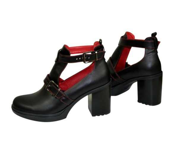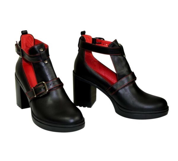 Стильні жіночі напіввідкриті ботильйони з чорної натуральної шкіри, на широкому стійкому підборі 7.5 см. спереду 1.5 см. Завдяки ремінцю регулюється обхват щиколотки. Ручної роботи з використанням виключно натуральних матеріалів високої якості. Відповідають стандартній розмірній сітці. Розраховані на стандартну повноту стегна. Можливий відшив у шкірі, замші різних кольорів.