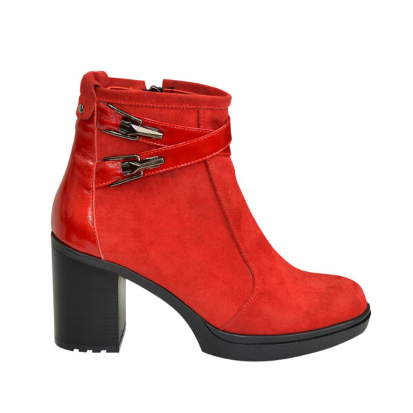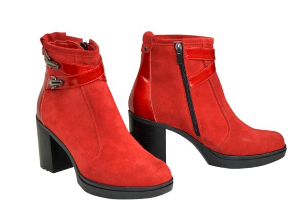 Модні стильні жіночі черевики на стійких підборах, виготовлені з натуральної замші та лакової шкіри червоного кольору. Декоровані ремінцями. Дуже зручні, ідеально сидять на ніжці – підкреслять вашу індивідуальність.