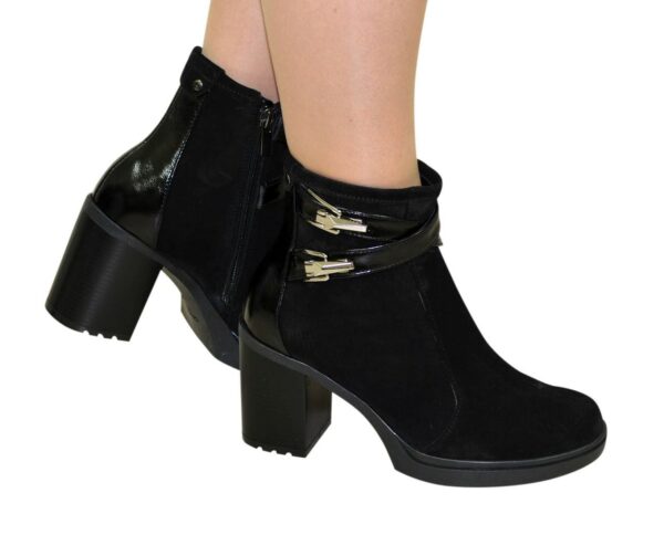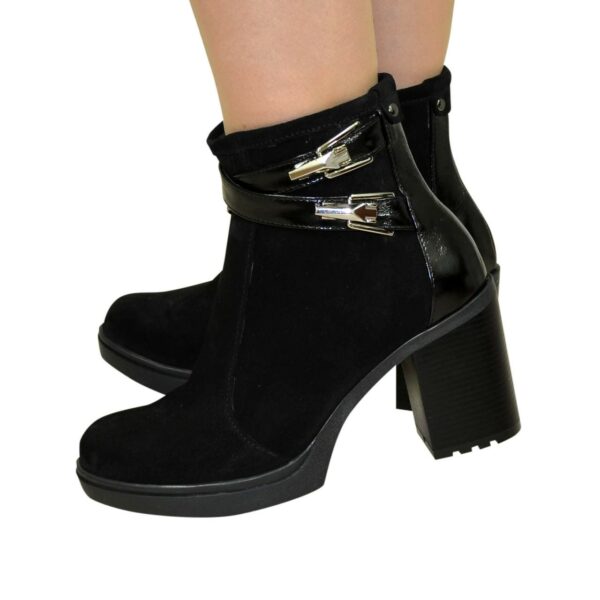 Модні стильні жіночі черевики на стійких підборах, виготовлені з натуральної замші та лакової шкіри чорного кольору. Декоровані ремінцями. Дуже зручні, ідеально сидять на ніжці – підкреслять вашу індивідуальність.