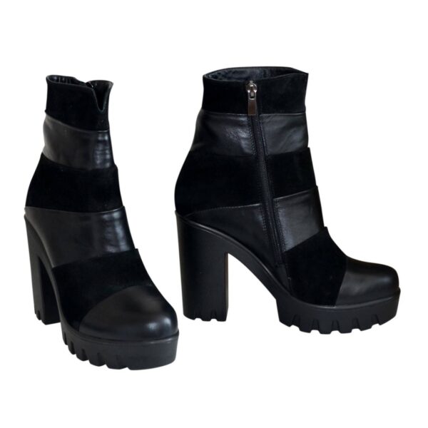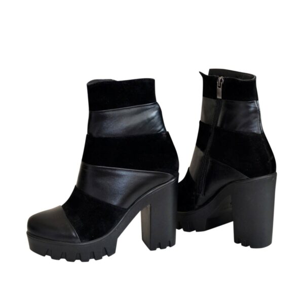 Черевики жіночі на широкому стійкому підборі, виготовлені з натуральної шкіри, комбіновані замшею чорного кольору. Незамінні на кожен день, дуже зручні, практичні, ідеально сидять на ніжці – підкреслять Вашу індивідуальність.