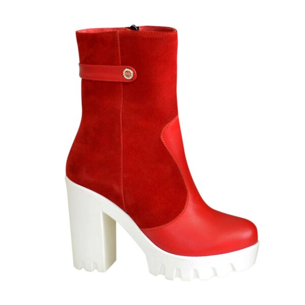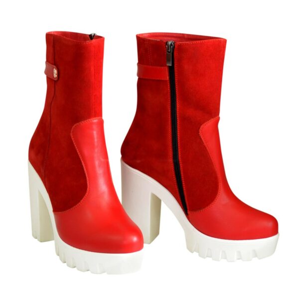 Черевики жіночі на широкому стійкому підборі, виготовлені з натуральної шкіри та замші червоного кольору. Декоровані ремінцем та фурнітурою Незамінні на кожен день, дуже зручні, практичні, ідеально сидять на ніжці – підкреслять Вашу індивідуальність