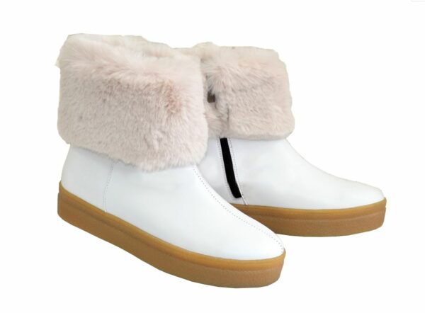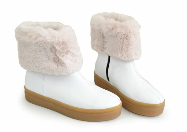 Модні стильні жіночі черевики на потовщеній підошві, виготовлені з натуральної шкіри білого кольору з хутряним узлісся. Практичні, дуже зручні, ідеально сидять на ніжці – підкреслять вашу індивідуальність.