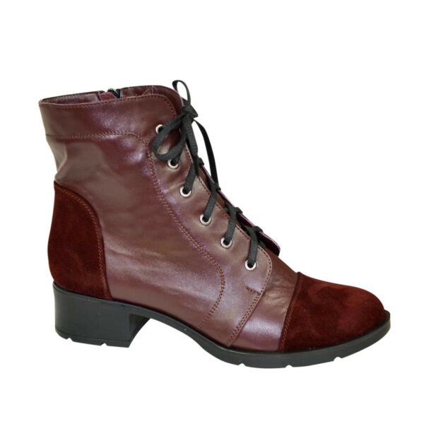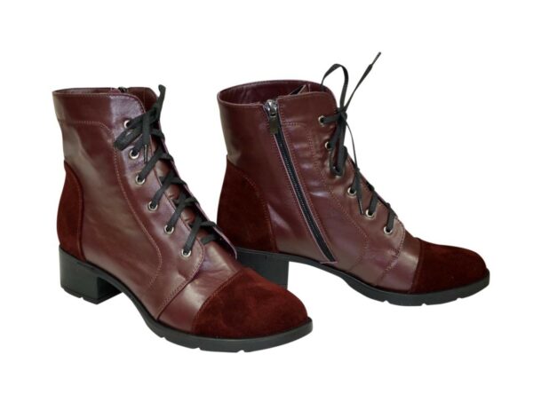 Класичні жіночі черевики на невеликому підборі, виготовлені з натуральної шкіри та замші бордового кольору. З блискавкою та шнурівкою завдяки якій регулюється підйом. Дуже зручні, ідеально сидять на ніжці.
