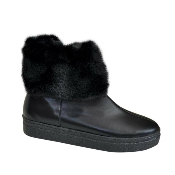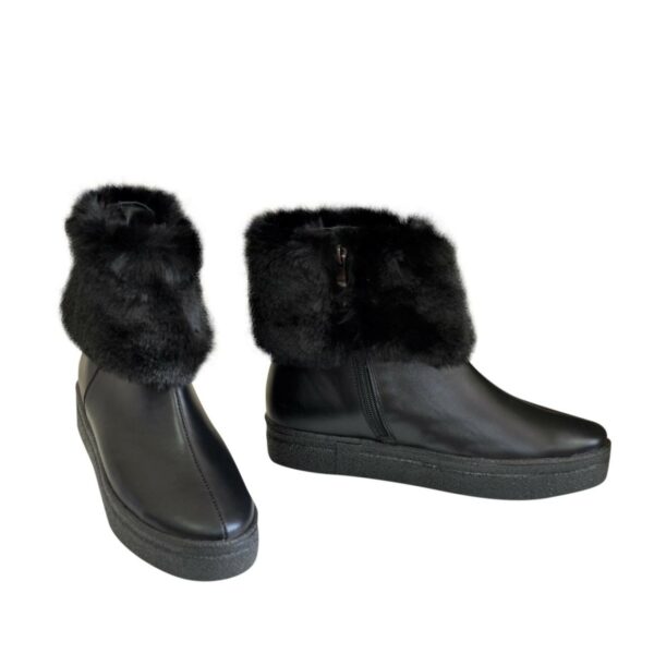 Модні стильні жіночі черевики на потовщеній підошві, виготовлені з натуральної шкіри чорного кольору з хутряним узлісся. Для зручності одягання передбачена блискавка. Практичні, дуже зручні, ідеально сидять на ніжці – підкреслять вашу індивідуальність.