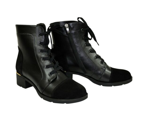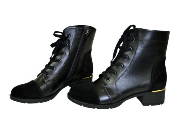 Класичні жіночі черевики на невеликому підборі, виготовлені з натуральної шкіри та замші чорного кольору. З блискавкою та шнурівкою завдяки якій регулюється підйом. Дуже зручні, ідеально сидять на ніжці.
