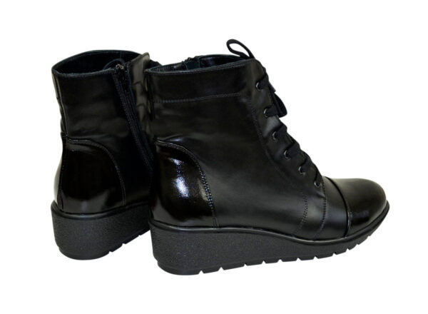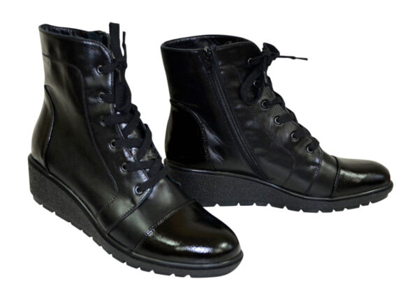 Класичні жіночі черевики на танкетці, виготовлені з натуральної шкіри та лакової шкіри чорного кольору. З блискавкою та шнурівкою завдяки якій регулюється підйом. Дуже зручні, ідеально сидять на ніжці.