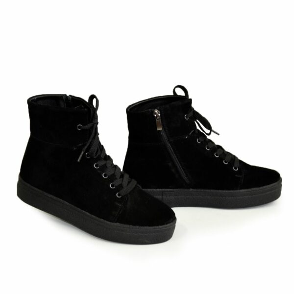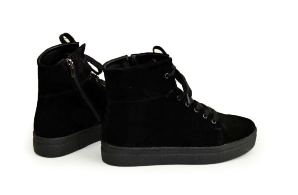 Стильні молодіжні жіночі черевики з натуральної замші чорного кольору на потовщеній підошві, м'які зручні. На блискавці та шнурівці, яка допоможе відрегулювати підйом. Утеплювач – за бажанням замовника БАЙКА, хутро ПОЛУШЕРСТЬ 70%. Повномірні, відповідають стандартній сітці розміру. У нас працює послуга "індивідуальне виготовлення". Можливий відшив у шкірі, замші різних кольорів. Класичні