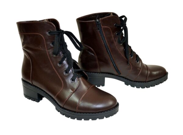 Класичні жіночі черевики на широкому підборі, виготовлені із натуральної шкіри коричневого кольору. З блискавкою та шнурівкою завдяки якій регулюється підйом. Дуже зручні, ідеально сидять на ніжці.