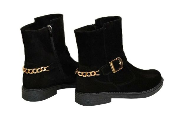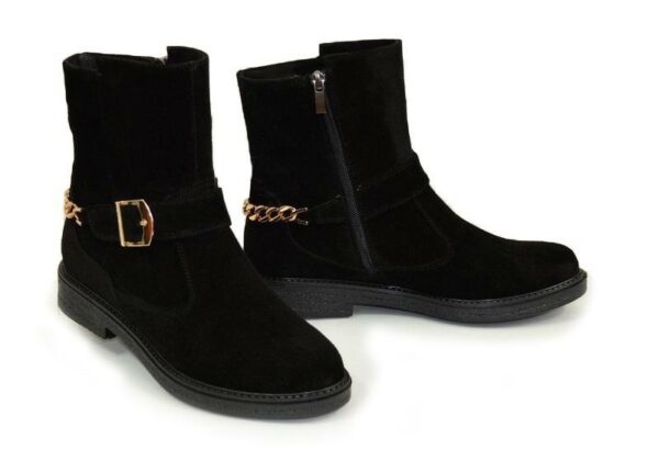 Модні класичні жіночі черевики на невисокому підборі, виготовлені із натуральної замші чорного кольору. Декоровані ремінцем та ланцюгом. Дуже зручні, ідеально сидять на ніжці – підкреслять вашу індивідуальність.
