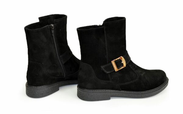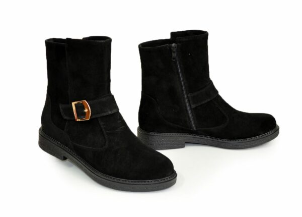 Модні класичні жіночі черевики на невисоких підборах, виготовлені з натуральної замші чорного кольору. Декоровані ремінцем. Дуже зручні, ідеально сидять на ніжці – підкреслять вашу індивідуальність.