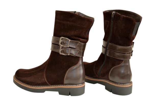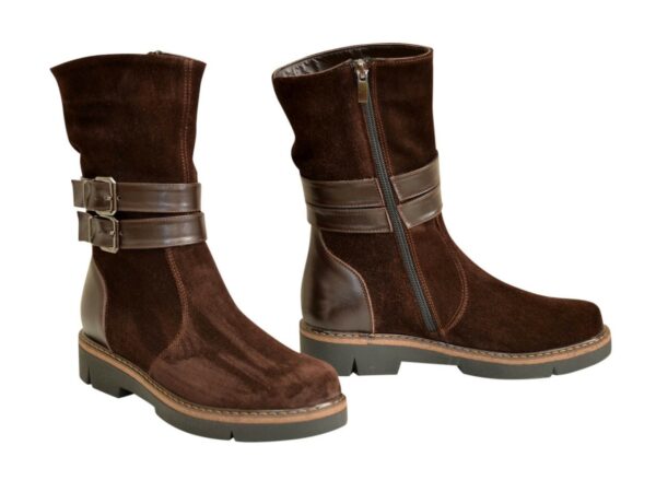 Жіночі півчобітки з натуральної шкіряної замші коричневого кольору, декоровані ремінцями та вставкою з натуральної шкіри коричневого кольору, на зручній потовщеній підошві.