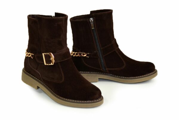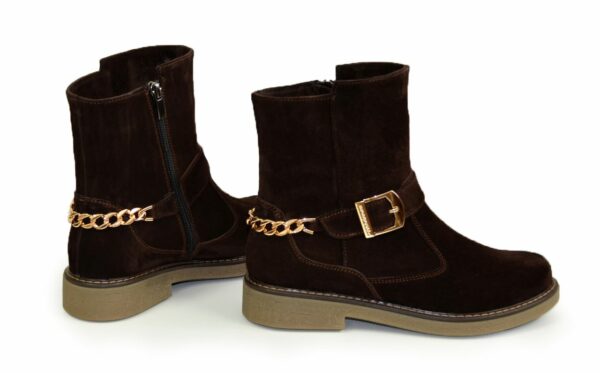 Модні класичні жіночі черевики на невисокому підборі, виготовлені з натурального коричневого чорного кольору. Декоровані ремінцем та ланцюгом. Дуже зручні, ідеально сидять на ніжці – підкреслять вашу індивідуальність.