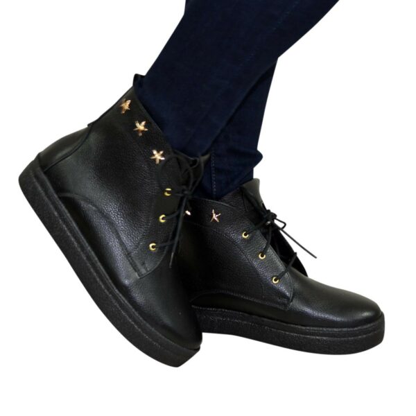 Стильні та модні жіночі черевики на потовщеній суцільній підошві, виготовлені з натуральної шкіри чорного кольору, декоровані фурнітурою. На шнурівці за допомогою якої регулюється підйом. Дуже зручні, ідеально сидять на ніжці – наголошують на Вашій індивідуальності.