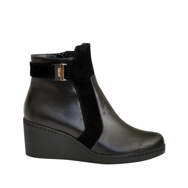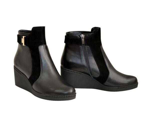 Класичні модні жіночі черевики на танкетці, виготовлені з натуральної шкіри, комбіновані натуральною замшею чорного кольору. Незамінні на кожен день, дуже зручні, ідеально сидять на ніжці – підкреслять вашу індивідуальність.