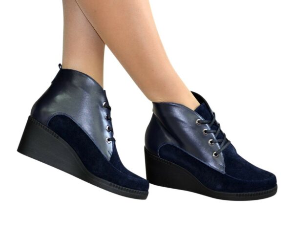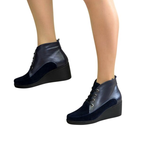 Класичні модні жіночі черевики на танкетці, виготовлені з натуральної синьої замші, комбіновані шкірою синього кольору. На шнурівці за допомогою якої регулюється підйом. Дуже зручні, ідеально сидять на ніжці – наголошують на Вашій індивідуальності.