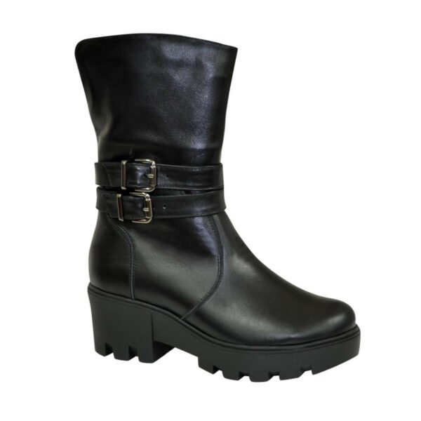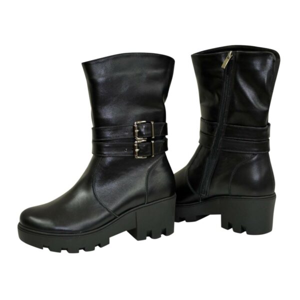 Жіночі шкіряні чобітки чорного кольору декоровані ремінцями на зручній тракторній підошві.