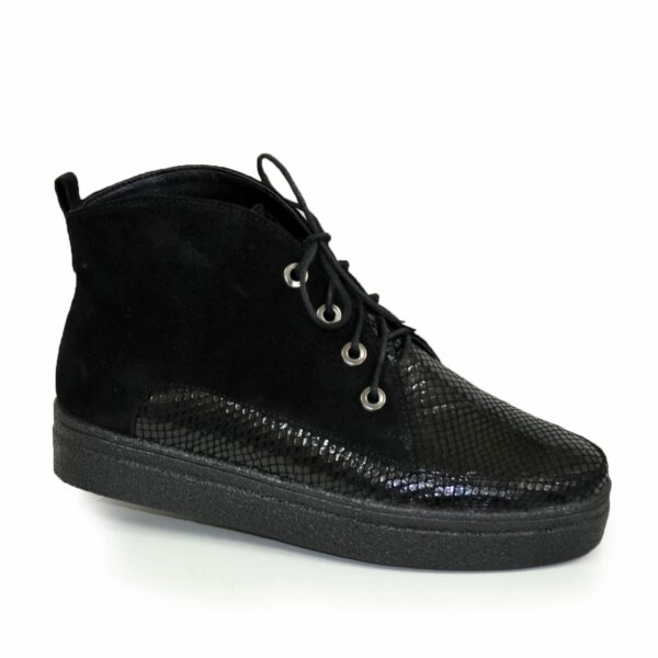Стильні та модні жіночі черевики на потовщеній суцільній підошві, виготовлені з натуральної замші з лазерним напиленням та замшами чорного кольору. На шнурівці за допомогою якої регулюється підйом. Дуже зручні, ідеально сидять на ніжці – наголошують на Вашій індивідуальності.