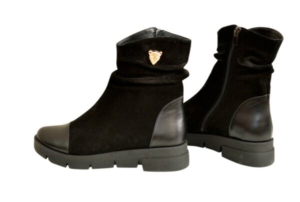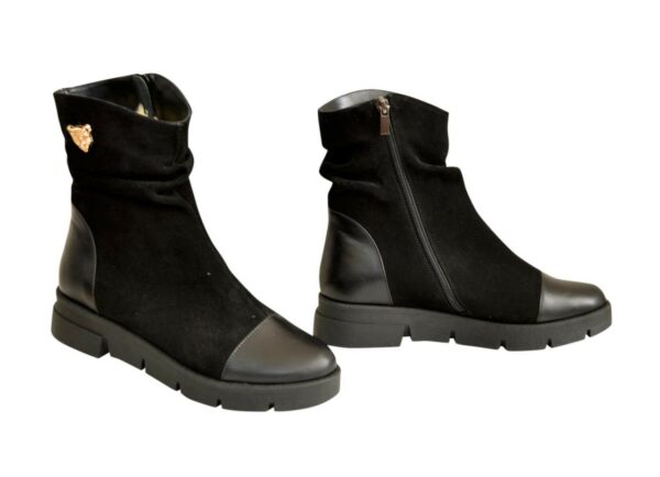 Стильні жіночі черевики на потовщеній підошві, виготовлені з натуральної замші та шкіри чорного кольору. На блискавці. Декоровані фурнітурою. Комфортні та акуратні, ідеально сидять на ніжці.