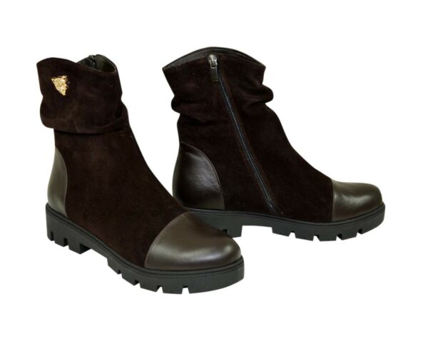 Стильні жіночі черевики на тракторній підошві, виготовлені з натуральної коричневої шкіри та замші. На блискавці. Декоровані фурнітурою. Комфортні та акуратні, ідеально сидять на ніжці.