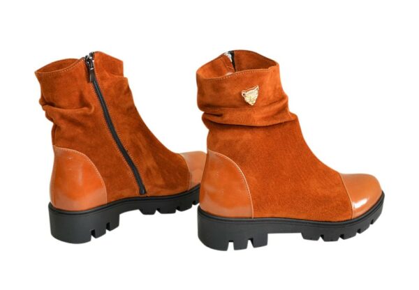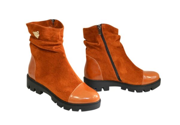 Стильні жіночі черевики на потовщеній тракторній підошві, виготовлені з натуральної рудої замші та шкіри. На блискавці. Декоровані фурнітурою. Комфортні та акуратні, ідеально сидять на ніжці.