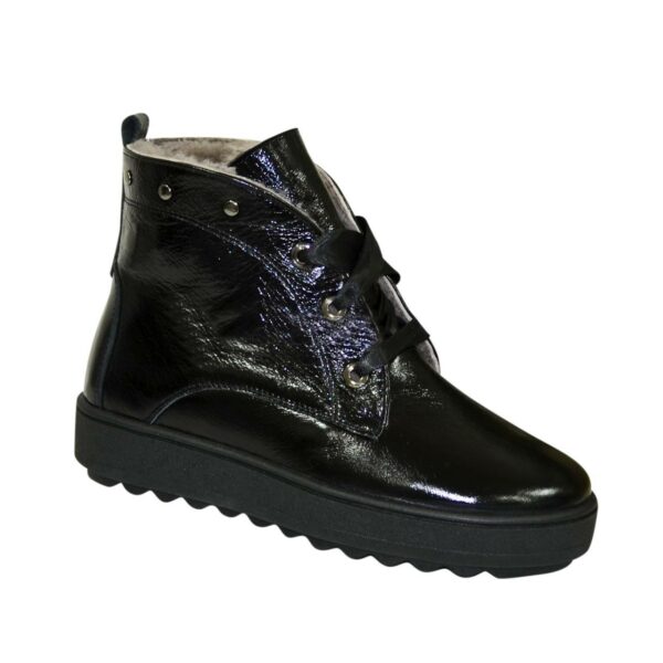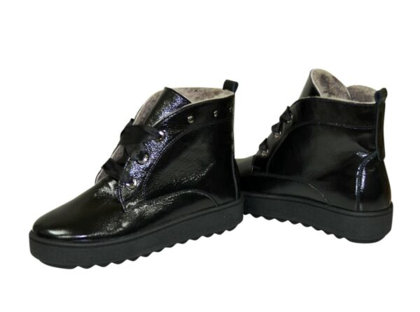 Стильні та модні жіночі черевики на потовщеній суцільній підошві, виготовлені з натуральної лакової шкіри чорного кольору, декоровані заклепками. На шнурівці за допомогою якої регулюється підйом. Дуже зручні, ідеально сидять на ніжці – наголошують на Вашій індивідуальності.